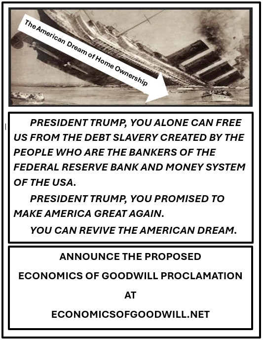 President Trump has the ability to provide the necessary executive orders to implement the proposed Economics of Goodwill Proclamation and free us all from the DEBT SLAVERY created by the people who are bankers within the national infrastructure of the USA, and doing this will immediately reduce debt, increase fairness and opportunity in our economy, and provide a Rebirth to the American Dream of Home Ownership.