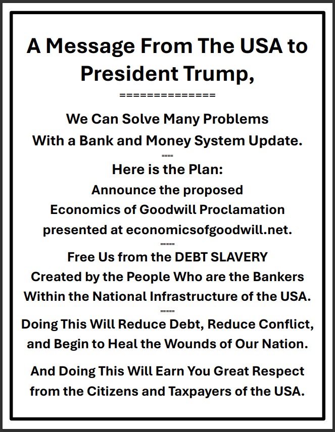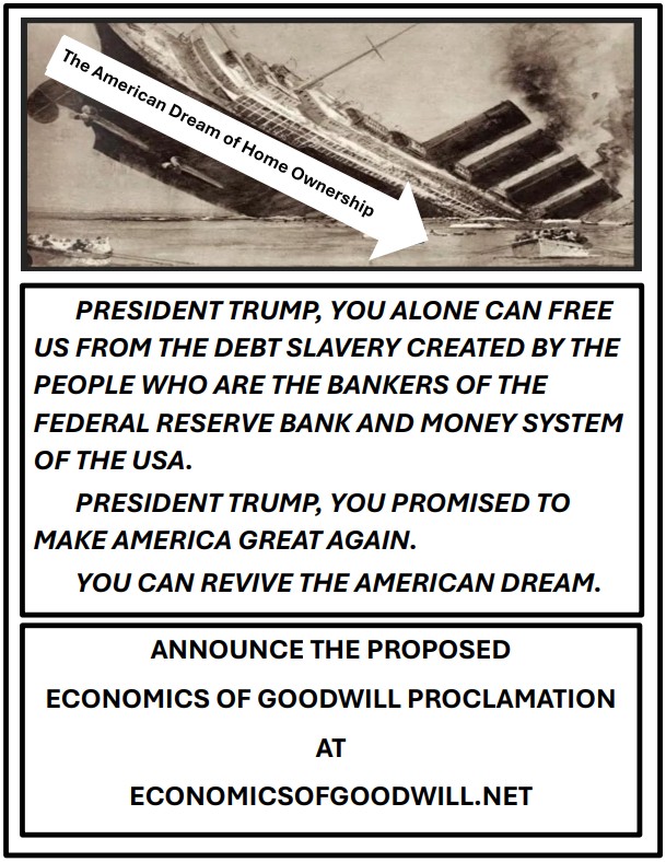 President Trump has the ability to provide the necessary executive orders to implement the proposed Economics of Goodwill Proclamation and free us all from the DEBT SLAVERY created by the people who are bankers within the national infrastructure of the USA, and doing this will immediately reduce debt, increase fairness and opportunity in our economy, and provide a Rebirth to the American Dream of Home Ownership.